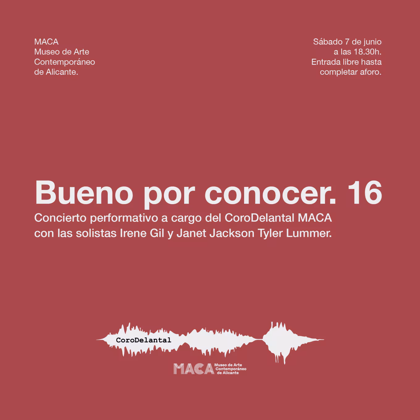 Concierto performativo a cargo del CoroDelantal MACA, dirigido por Sonia Megías, realizará un viaje emocional a través de la voz, con las solistas Irene Gil y Janet Jackso Tyler Lummer. Este viaje partirá de las 'partituras raras', notaciones experimentales creadas específicamente para el coro; pasando por los amores rotos que nos trae la música popular, y acabando por una denuncia anticapitalista, antirracista y antiesclavista de la mano de solistas invitadas que harán resonar sus cantos en las obras de la exposición de Kara Walker.